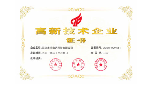 根據國家《高新技術企業認定管理辦法》和《高新技術企業認定管理工作指引》的相關規定,鴻逸達科技榮獲國家級高新技術企業稱號,由深圳市科技創新委員會、深圳市財政局、國家稅務總局深圳市稅務局聯合頒發,這是對鴻逸達科技近4年來拼搏進取的成果肯定。